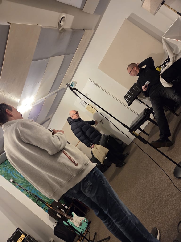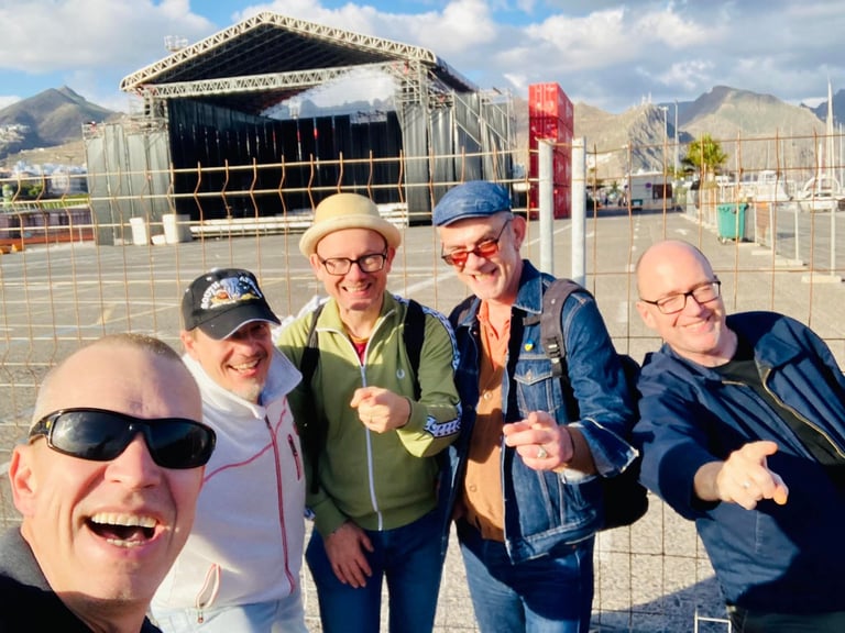 Prüfer: Du kannst mit neun Leuten auch einfach richtig was los machen. Mit drei Bläsern und zwei Gitarren, Keyboards, Bass und Schlagzeug kannst du halt auch so eine Wand aufbauen. Außerdem spielen mehrere Profimusiker mit. Lorenz Allacher, der später bei Rosenstolz mitgemacht hat, ist bereits vor 12 Jahren gestorben. Unser Bariton-Saxophonist ist Berufsmusiker, unser Trompeter ist ebenfalls Profi, unser Drummer war mal Berufsschlagzeuger, alles Studiomusiker. Unser Ersatzgitarrist ist festes Ensemble-Mitglied von Dieter Bohlen gewesen.