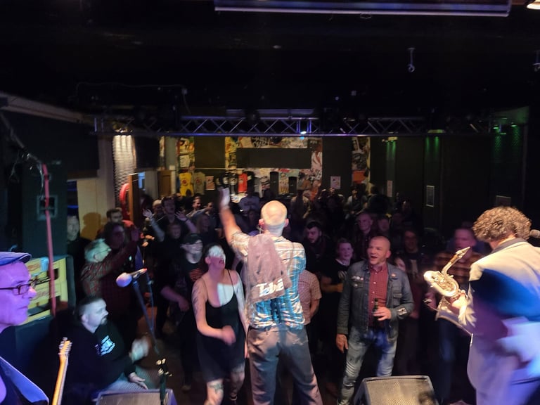 Prüfer: Das hast du ganz schön gesagt, Ska ist im Alter kein Handicap. Das war schon immer so. Und die Bands, die Blechreiz beeinflusst haben, also die Specials oder Madness und so weiter, die gibt es ja auch noch alle. Madness treten jetzt im Juni wieder in Berlin auf. Und die sind ja fünf, sechs, sieben, acht Jahre älter als wir.